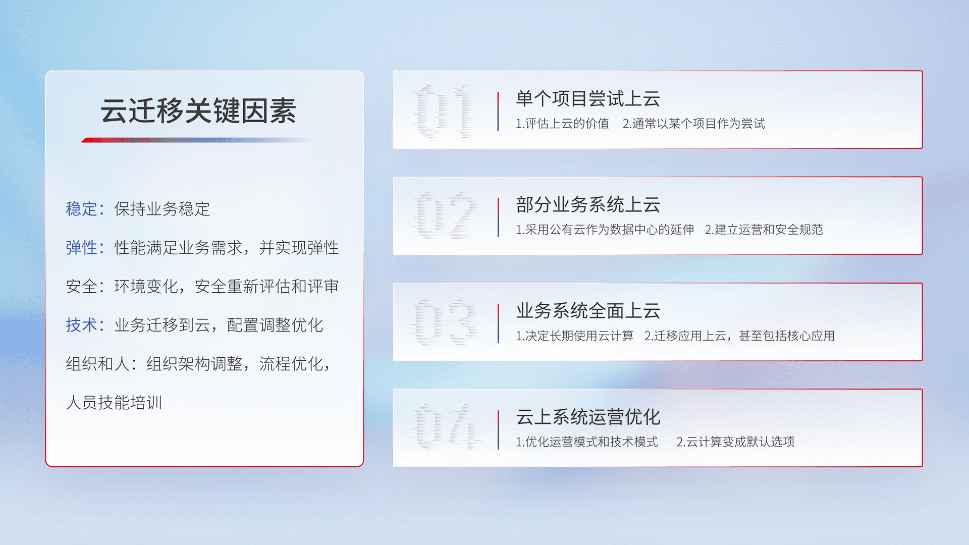 结合实际业务,,从规划设计、、、云平台选型、、云原生改造、、数据迁移、、集成交付,,迁移全过程为客户识别最佳上云路径,,,,做好风险识别管理,,,设计网络架构、、、、身份权限、、、安全审计合规、、、操作审计、、、日志审计、、监控告警策略、、、多站点容灾设计等,,对云上基础设施进行整体规划,,,提升IT治理水平,,,,以满足弹性、、高可用、、、、高性能的需求。。
